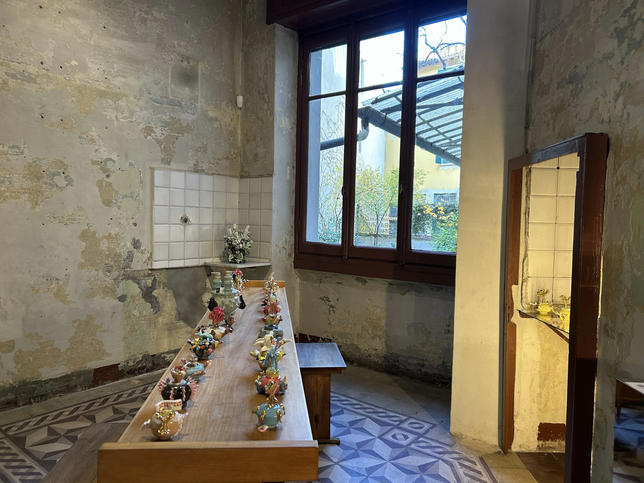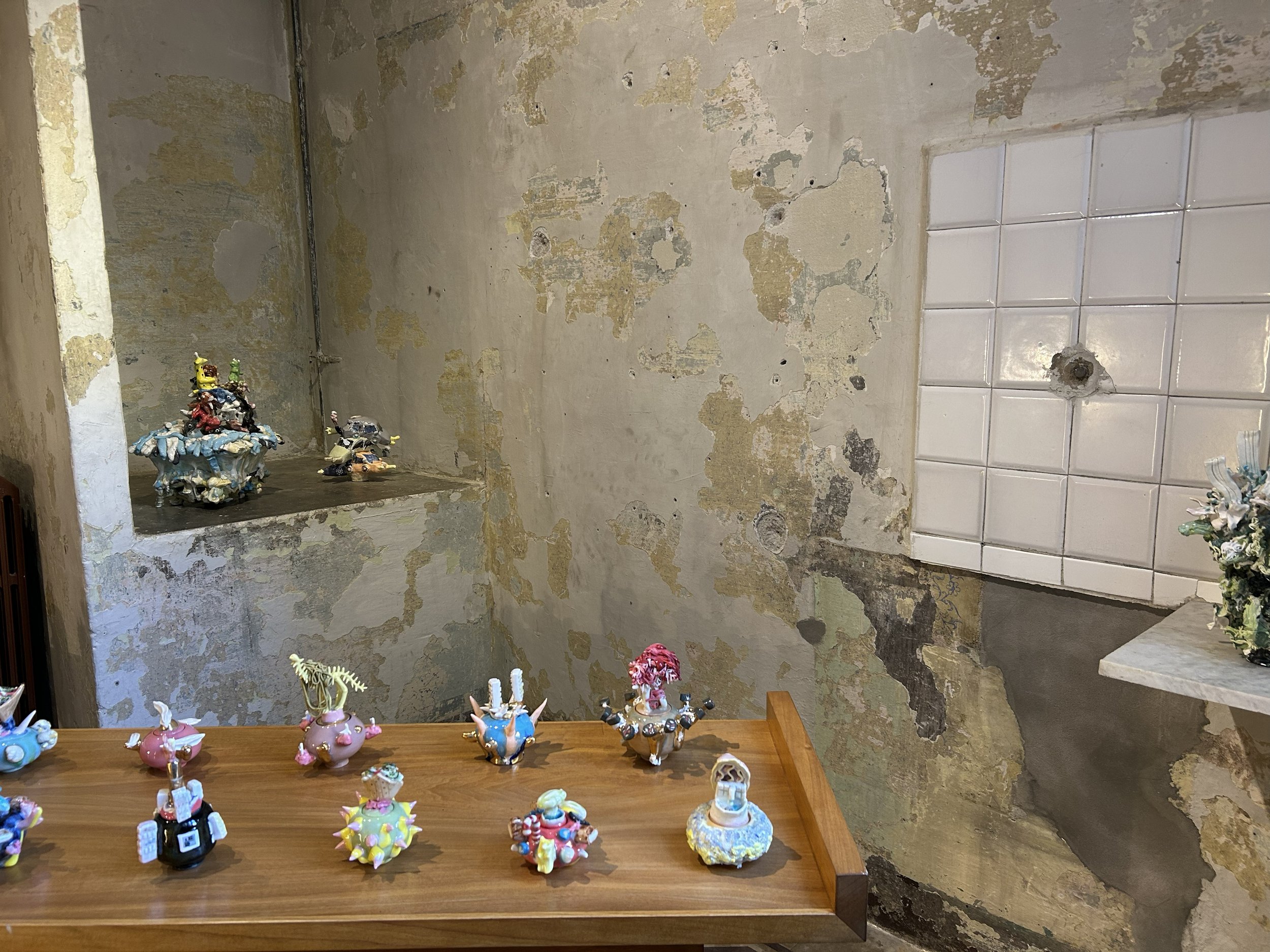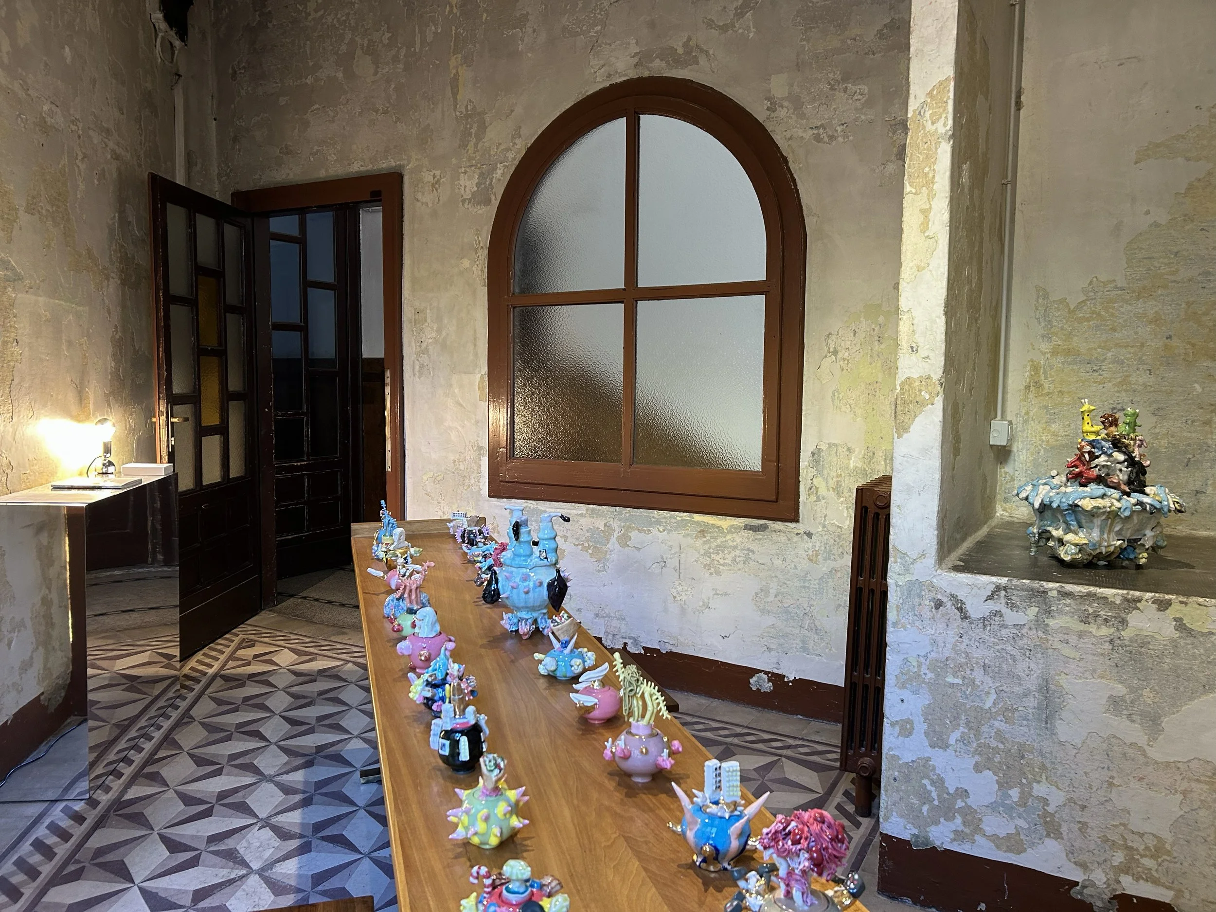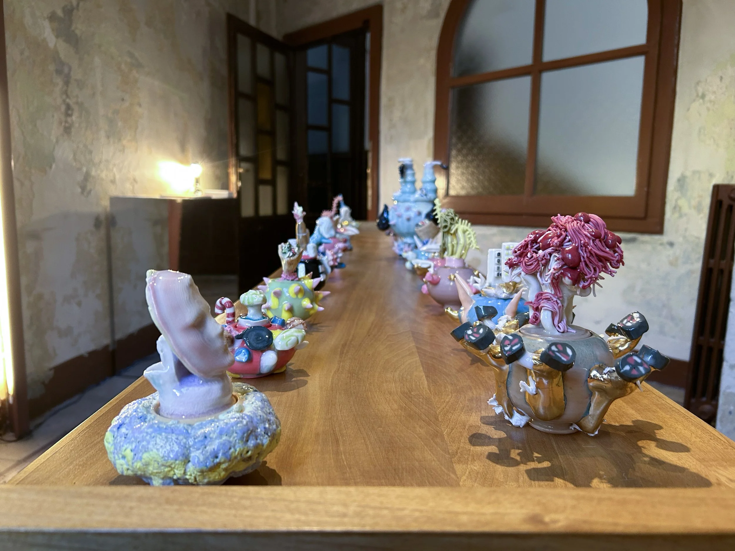 La mostra - allestita su arredi disegnati da Giovanni Michelucci nel 1957 per la sede della Cassa di Risparmio di Firenze, provenienti dalla collezione della Galleria Luisa delle Piane - presenta un nucleo di piccoli e preziosi lavori in porcellana e una selezione di opere in ceramica di medie dimensioni che diversamente raccontano la sarcastica e sagace poetica della Arrieta, votata ad esplorare contestualmente il mondo tangibile del reale e quello chimerico del virtuale, tra immaginazione e fantasia.