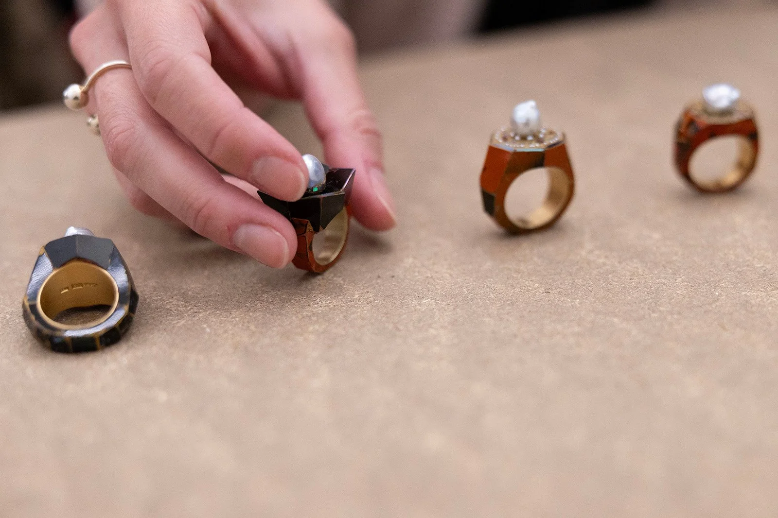 Kimiaki Kageyama’s pieces – little leaves, branches, rings adorned with pearls – are distinguished by his use of urushi, a resin extracted from the tree of the same name.